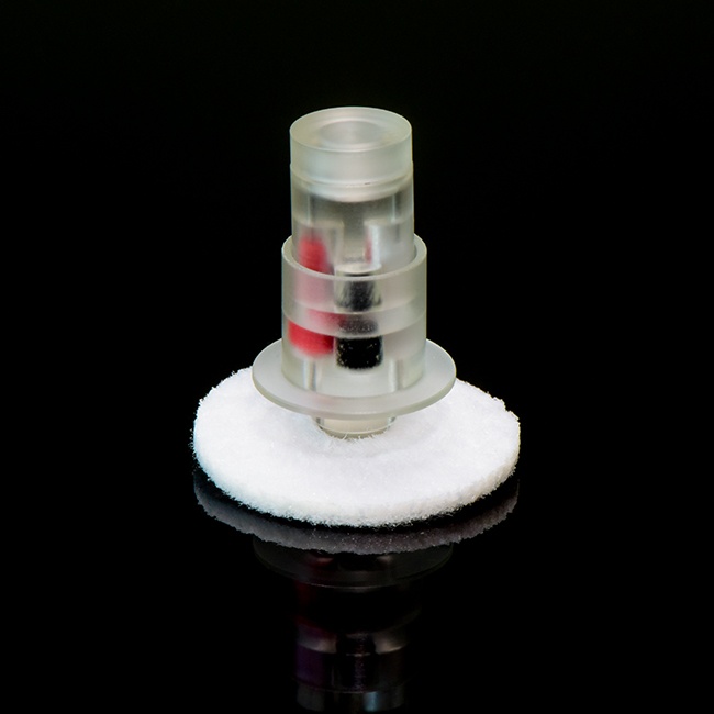 这种可植入纽扣含有三个单独灌流通道,通过与相应的系绳简单连接使用。它与单通道、双通道的大鼠纽扣式马甲大小相同,在纽扣的毛毡底端为22ga的针口,分别与三根3Fr管路相连。
