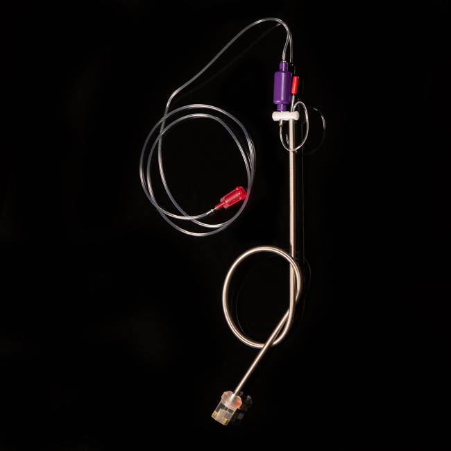 配合使用的系绳通过磁铁卡进纽扣中,以大限度减少对动物的应力。与25ga双通道转环配合使用时,可选择其中一个转环通道与管路相接以便连续使用,而另一条管路与堵头连接进行不间断性给药或取样。