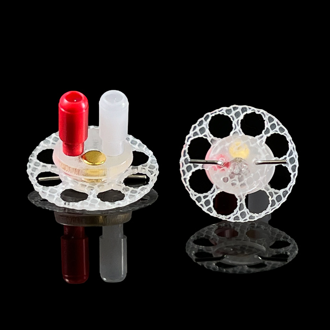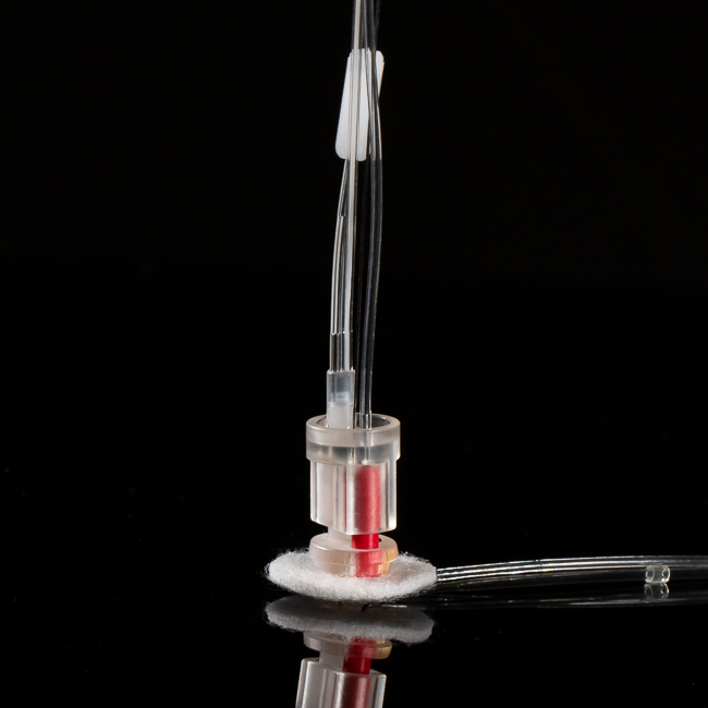 这种可植入纽扣含有两个单独灌流通道,通过与相应的系绳简单连接使用。该款马甲专为葡萄糖钳夹实验以及同时进行采血和灌流的实验操作而设计。马甲内的PinPort有两个颜色,分别为红色和白色,均可以与PNP3M堵头注射头配合使用进行手动操作。