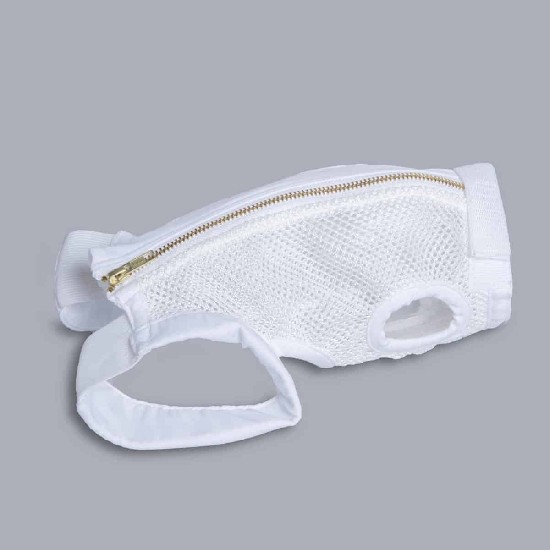 夹克由双层聚酯网布制成,颈部和手臂开口用棉质针织物包扎,穿着舒适。弹性材料的双缝条连接各层,提供灵活性和耐用性。背部用拉链闭合。