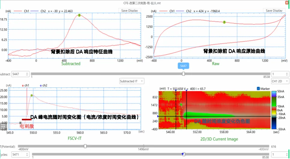 示例:采用活体脑化学物质实时分析系统动态监测电刺激引发的脑内多巴胺释放回收过程(植入位点:电刺激电极位于VTA脑区, DA检测电极位于NAc脑区。电刺激方式:±300uA, 2ms, 60Hz 双极电刺激, 持续1s)。