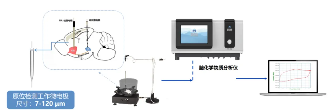 肖博士分享到:活体脑化学物质实时分析系统是一种用于实时监测活体动物脑内化学小分子动态变化的传感系统。该系统通过将微型化电极植入目标脑区,从而能够实时、精准地监测大脑中的多种化学物质,包括神经递质、能量代谢物质和离子等。活体脑化学物质实时分析系统的实时动态监测和高时空分辨率特性使得该系统在神经科学领域具有广泛的应用前景。