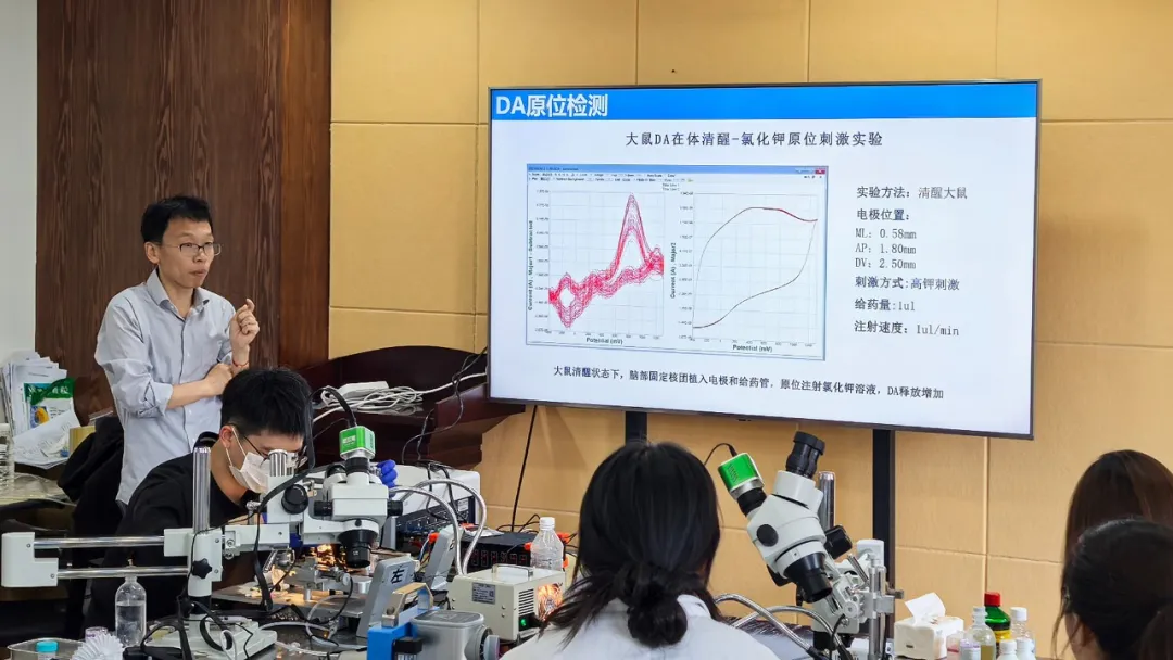 24日,由铭泰佳信技术工程师黄金风围绕“活体脑化学物质实时分析技术”展开培训。活体脑化学物质实时分析技术致力于在体脑内化学物质实时分析,如多巴胺,葡萄糖,乳酸,氧气,pH值,钙离子,钾离子,抗坏血酸(VC)等。现场细致地讲解了小鼠脑部多巴胺电极如何埋置以及实时检测。