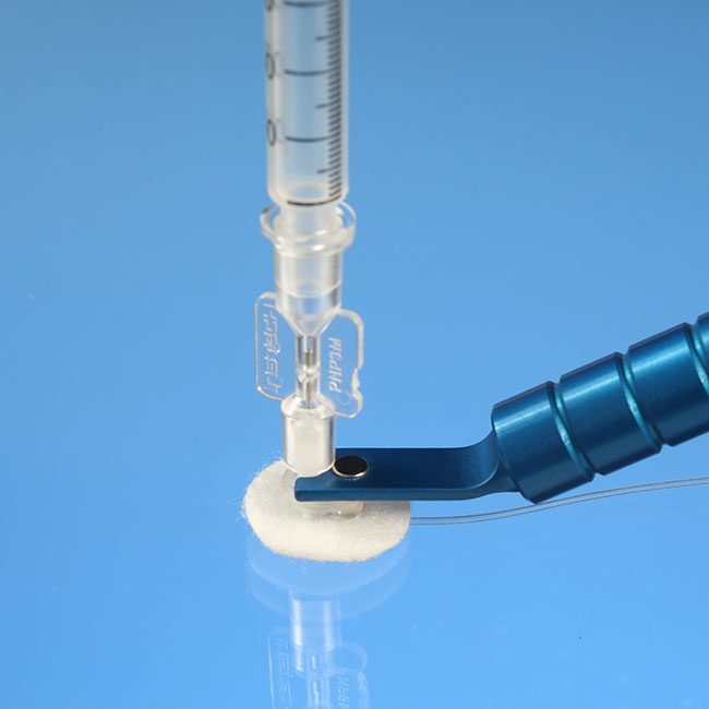 该采血系统采血方式如下:用处理工具握住小鼠马甲,注射器通过使用PNP3M刺入马甲进行手动采血。或通过PNP3MS连接头与血液收集管连接刺入马甲内进行精准取血。