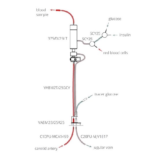Instech提供了在大鼠和小鼠上进行此项实验的完整系统,从动脉、静脉埋置管所需要的管路、给药系统连接的接头,并带有3个和4个方向连接器的特殊系绳,以及控制胰岛素、葡萄糖、红细胞等物质输送的灌流泵。